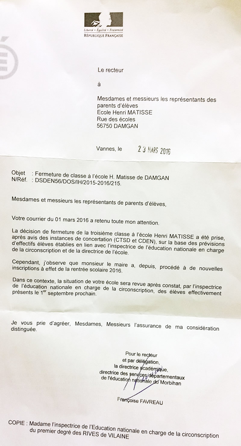 Réponse de l’Académie au courrier des parents d’élèves contre la fermeture d’une classe 27 mars 2016 par jerome L’Académie a répondu à notre courrier du 1er mars: