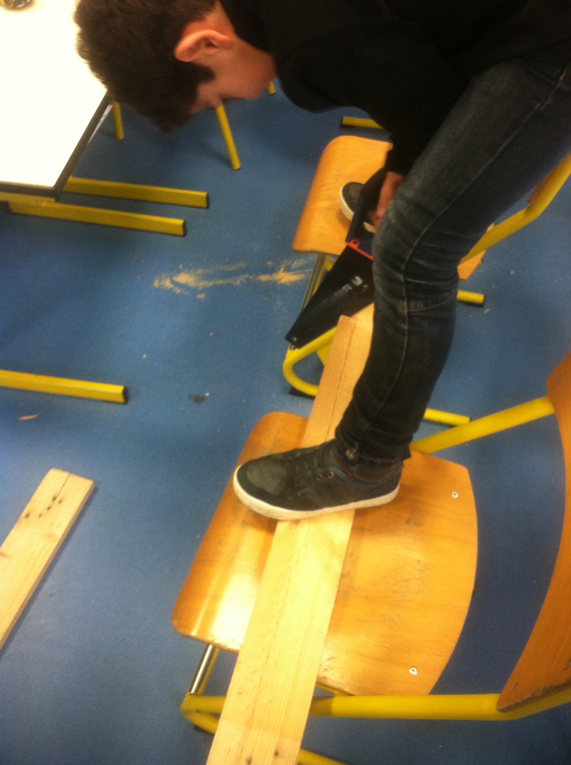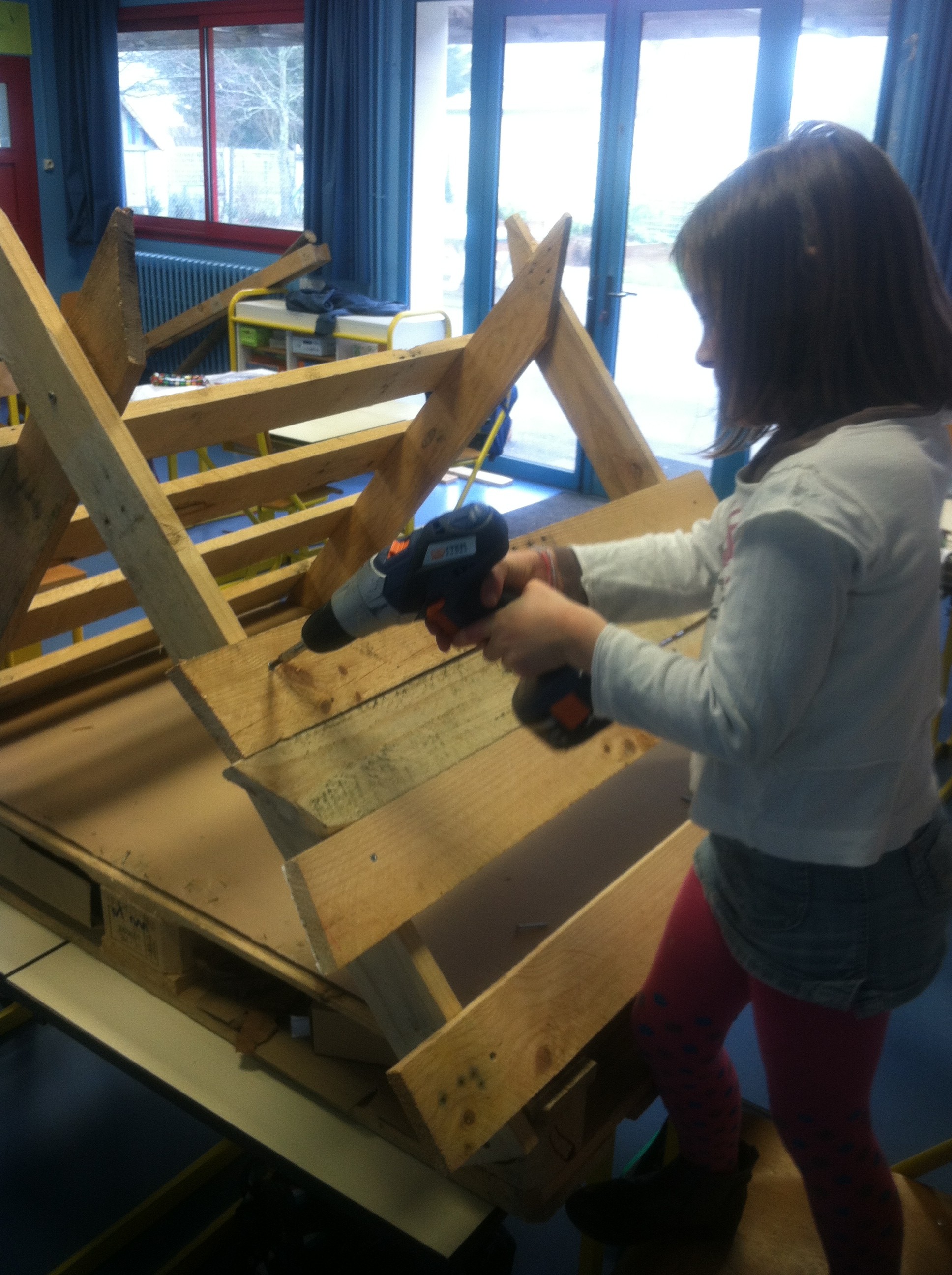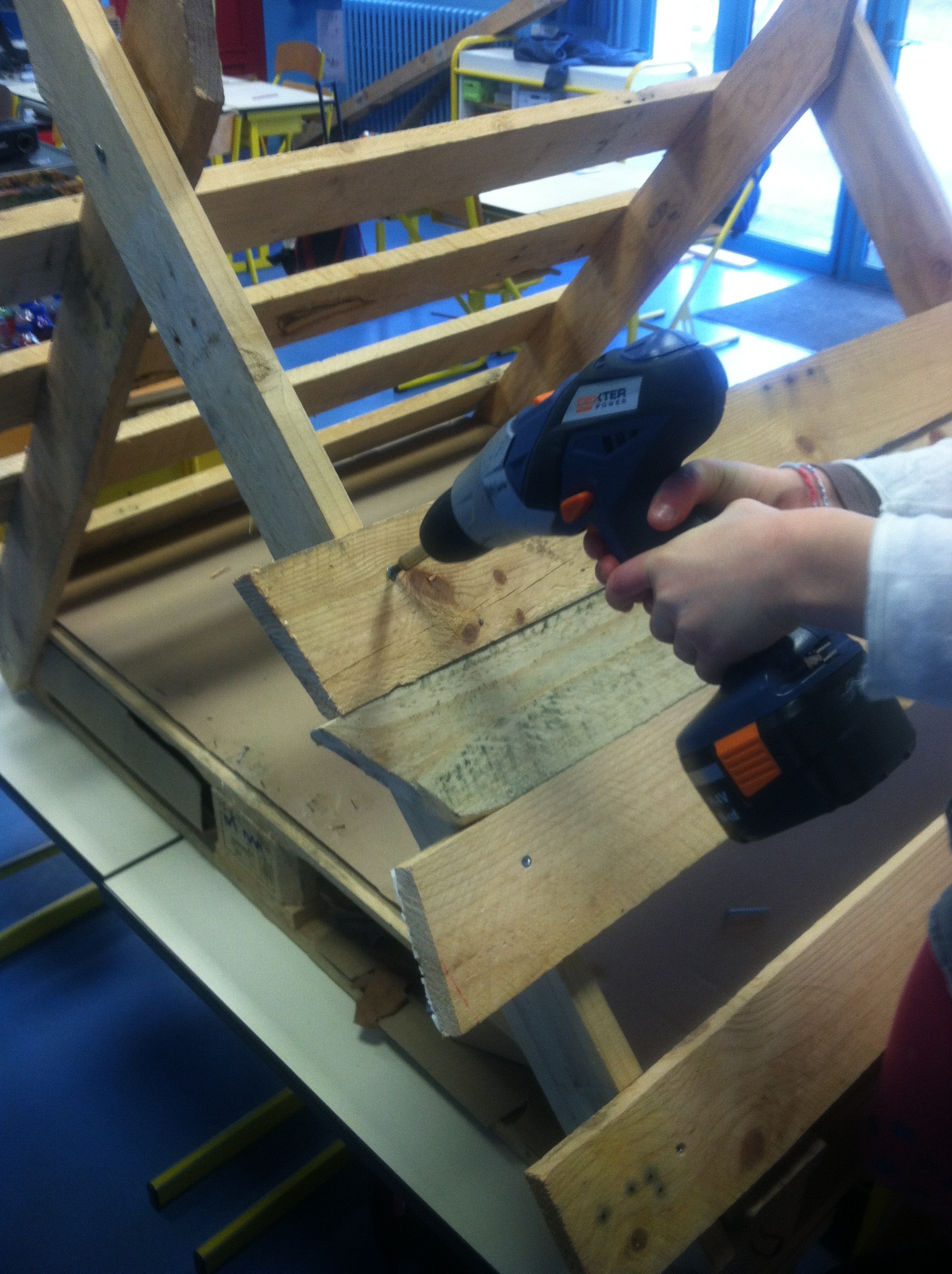 On commence à construire le toit avec des planches récupérées sur des palettes!