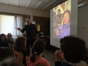 Ce matin, nous restons au chaud pour assister à la conférence d’un célèbre météorologue/showman. Les enfants sont captivés !